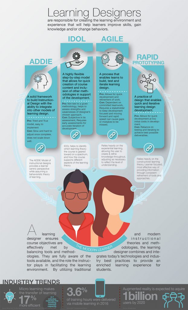 Agile Design Methodology allows for courses to be created,iterated, and improved upon by a cross-functional team in a reduced time frame.Agile teams utilize this framework to take advantage of these dedicated resources in close proximity to iterate on all facets of the content and course development. The agile process allows designers to take better advantage of traditional Instructional methodologies and improve the quality of the outputs in a faster time frame. Agile methodology provides a set of tools and processes that enable rapid development of instructional design.